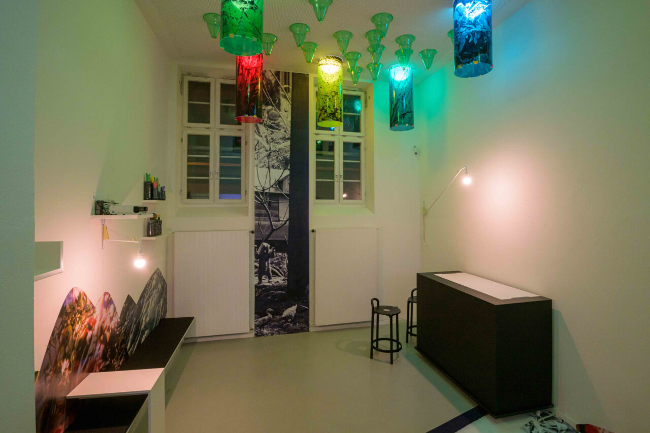 Shapes and images of the plant world form the basis for the design, both in reused transparencies from the artist’s earlier works and in objects newly developed by the designer. In this way, processes of recording, recycling and ongoing development create an artistic framework and a new spatial concept for communicative exchange within the Kunstverein’s Till Ten event series.